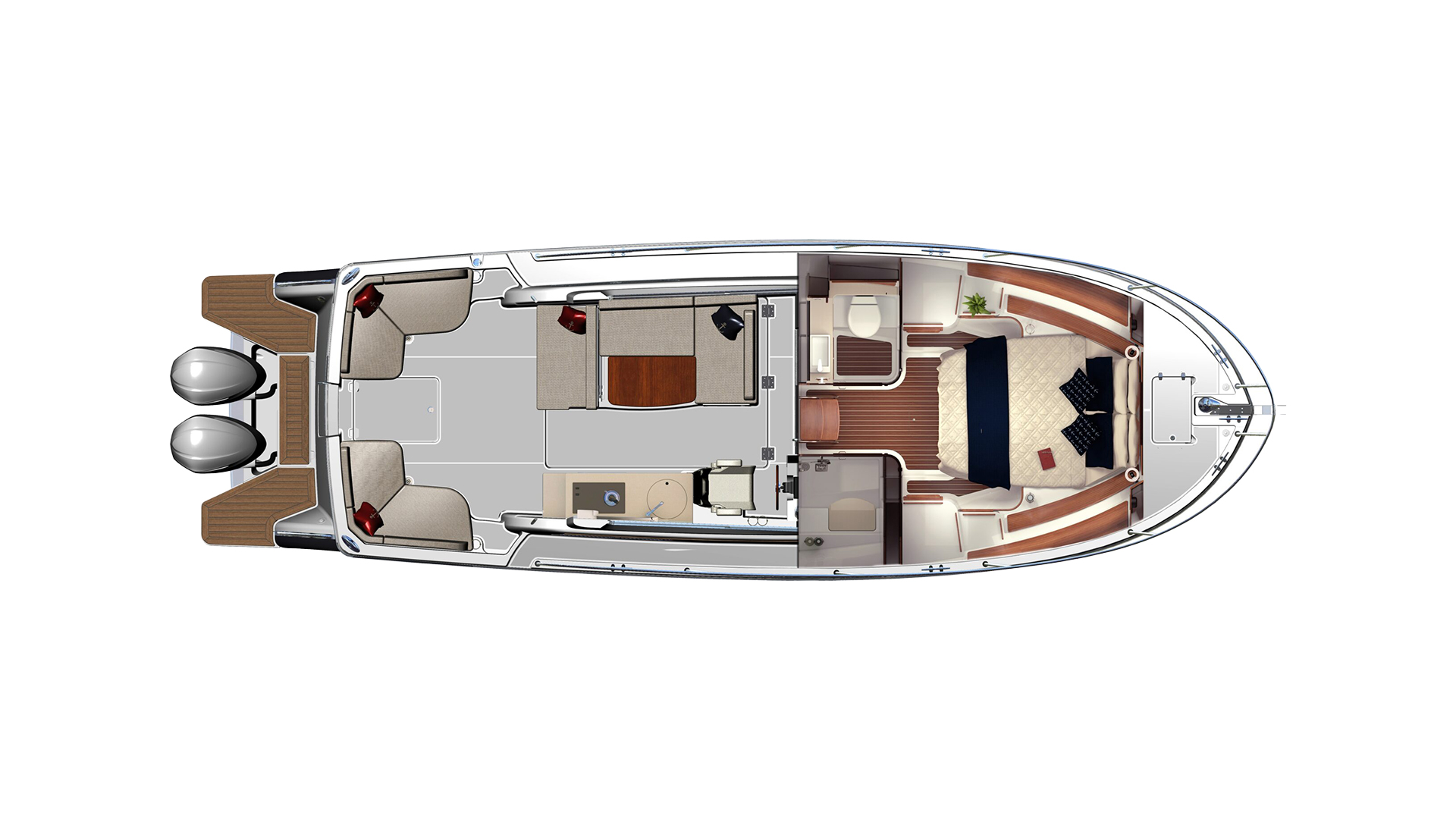 The upper deck layout is borrowed from the Back Cove 32 and will feature a functional galley aft the helm to starboard with a convertible bench to port that can face aft to the cockpit or forward to form a U-shaped dinette. The single level deck will allow for easy entertainment, with an open layout from the helm to the cockpit. An air-conditioned forward berth and a split-head design make this boat ideal for the weekend getaway.