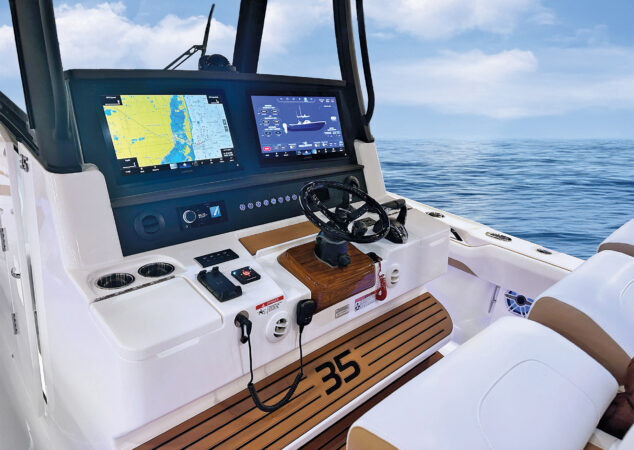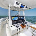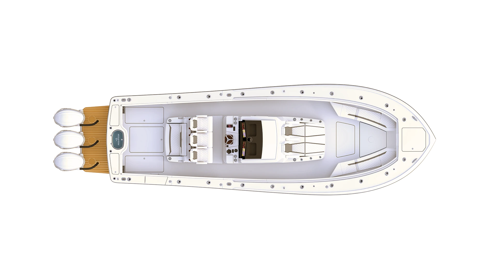 The 35 is powered by triple 350hp Yamaha engines and a 405-gallon fuel tank for optimal range. This boat can also be optionally equipped with an E-Hub Lithium Battery System, which helps maximize fuel consumption and efficiency. Other notable features include a dedicated mechanical room, a sea chest to self-clean and flush raw water systems, and the new Seakeeper Ride trim controls for seamless operation.