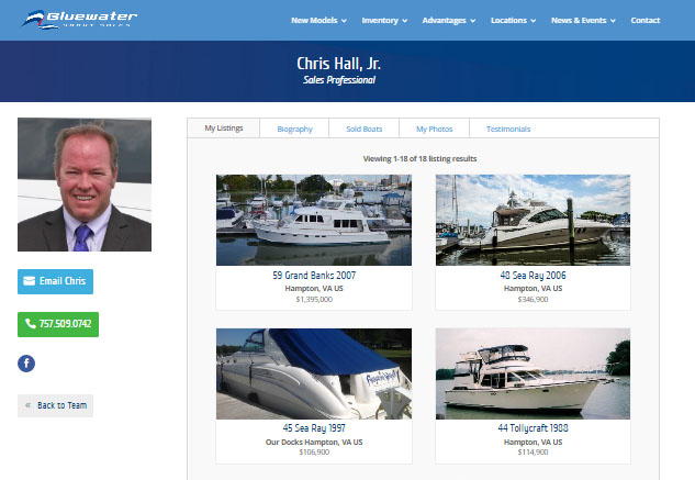 Continuing to boast expanded sub-sites for each of the company's Sales Professionals, Bluewater's unique team pages and "PURL" system allow users to learn more about each team member by way of biographies, social media and personal photos, as well as browse their current listings, sold boats and customer testimonials.