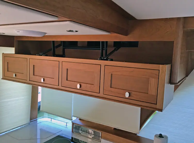 Being their fourth Sabre and benefitting from a long relationship with Bluewater and Sabre, the couple knew what to expect during the build process and had frequent meetings with Sabre’s National Sales Manager, Lynn Beaudoin to discuss ideas for customizations. Nick explains, “Tina collaborated with Sabre to make the galley work better for liveaboard cooking. Custom items include a Miele oven, custom cooktop, electrically raised cutouts in the countertop for storage and electrically lowering overhead cabinets, plus an electric grill in the cockpit.”