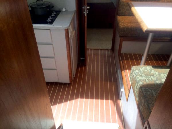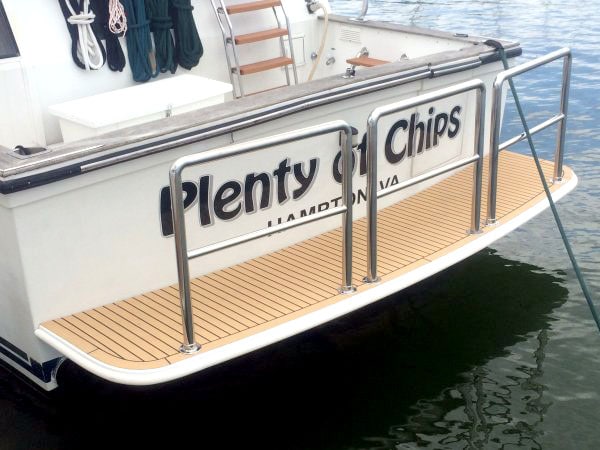 On a side note, I continue the upgrades to the boat and took on two fairly major projects over the Winter. The first one was re-building the swim platform. If you remember the prior owner backed the platform into a dock and cracked up the corner. I pulled the platform off and spent 2 months in the garage working on it. It’s a good thing I did because due to the cracked corner, water got inside and was rotting the wood core. I got a lot of experience with foam, glass and epoxy, but in the end, it turned out well. Here’s a pic of the results. BTW, the rails were fabricated by Matt in your service department [Bluewater Yacht Yard, Hampton]. He was quite proud of his work and I think he did a really great job. The second pic is of the galley where I laid a teak and holly floor (faux). The original teak parquet was showing it’s age, however, I did not want to alter the original teak, so I laid a rubber sub floor between the original and new. So, if a future owner wishes to go back to original, it will be easy to pull up the teak and holly.
